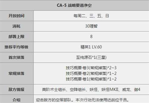 CA-5战略要道净空是一种需要迎击敌方空军部队的关卡,在每周二、三、五、日开放。此关卡要求玩家不能使用近战位干员。以下是攻略: