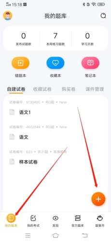 1、进入APP后,首先点击左下方的“我的题库”,再点击右下角的“+”;