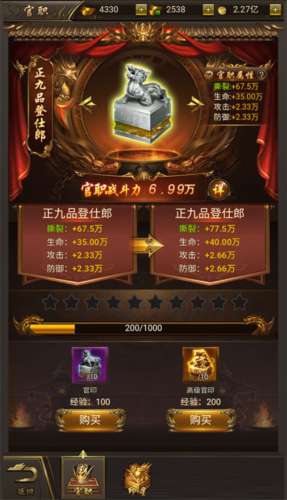 3、爵位:能提升玩家的官职,还能对官职进行强化,从而获得大量的属性