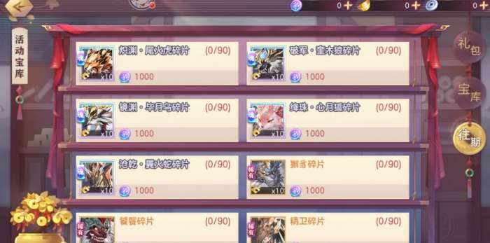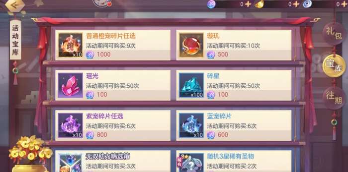 活动宝库方面,用「魂宠币」可以兑换往期稀有橙宠碎片、璇玑、瑶光、碎星、无双助力精选箱,以及普通橙宠碎片任选。资源种类比较全,按自己需求兑换就好。