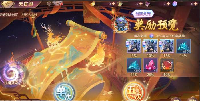 天官阁是这次活动的核心抽卡入口。用「幻穹券」或者限时道具「秘灵券」都可以召唤。每抽一次,必定获得「魂宠币」×60,同时有概率抽到「凌霄·星宿马」整体、碎片,或者「璇玑」、「瑶光」、「碎星」这三种养成材料。这三种材料是用星光提炼出来的,专门用在无双灵宠的淬星仪里面,可以提升灵宠属性,养成党要注意多囤一些。抽卡攒下来的「魂宠币」,可以在界面右下角的「灵宠宝库」里兑换。里面有往期稀有灵宠碎片、璇玑、瑶光、碎星,还有无双助力精选箱和随机3星稀有圣物,选择还挺多的。