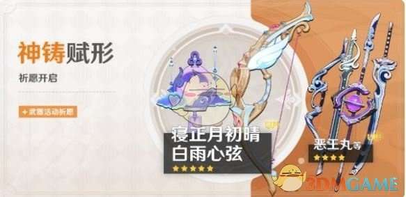 3、祈愿·神铸赋形:活动期间,限定5星武器“法器·寝正月初晴”“弓·白雨心弦”的祈愿获取概率大幅提升,同时限定4星武器“双手剑·恶王丸”“长柄武器·断浪长鳍”“弓·朦云之月”以及4星武器“单手剑·笛剑”“法器·昭心”的获取概率也会提升。