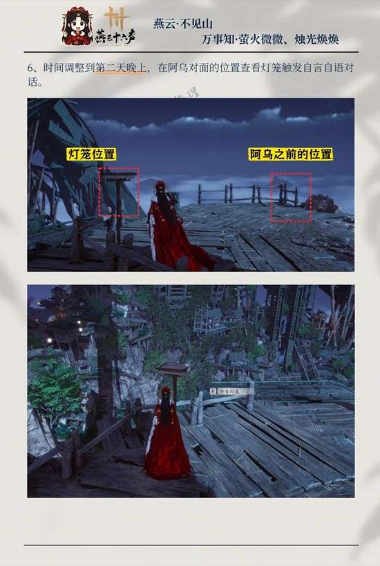 6、时间调整到第二天晚上,在阿乌对面的位置查看灯笼触发自言自语对话。