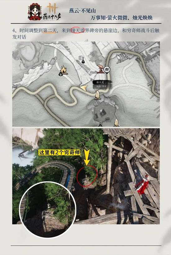 4、时间调整到第二天,来到接天道界碑旁的悬崖边,和穷奇师战斗后触发对话