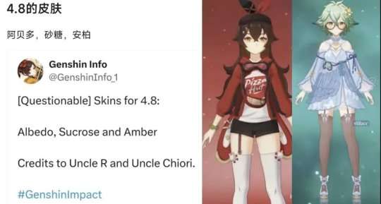 根据舅舅们爆料的最新消息来看,部分角色的新皮肤也终于要来了,在后续的4.8版本中,有新皮肤的三位角色分别是:阿贝多、砂糖、安柏,其中阿贝多、砂糖这两位角色有新皮肤,其实在很早之前就有过爆料,不过这次舅舅们却直接出来实锤了,安柏的新皮肤也丝毫不意外,这下倒是把御三家的皮肤都补齐了。