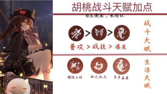 开篇的时候讲过,胡桃是一个依靠重击蒸发打伤害的角色,重击恰好被普攻该天赋囊括,所以普攻优先升级。战技是依靠胡桃基础攻击力为自身提高伤害的,第二升级(两个天赋相辅相成)爆发就是为胡桃回血的,因为她战技会扣血,没有生存位的话大招还是有些用途的,但一般来说胡桃都会配个盾(如钟离,莱依拉)所以大招要不要都行。由于两个固有天赋是需要胡桃半血以下才能触发,所以要格外注重胡桃在场时的生命值,以防被秒