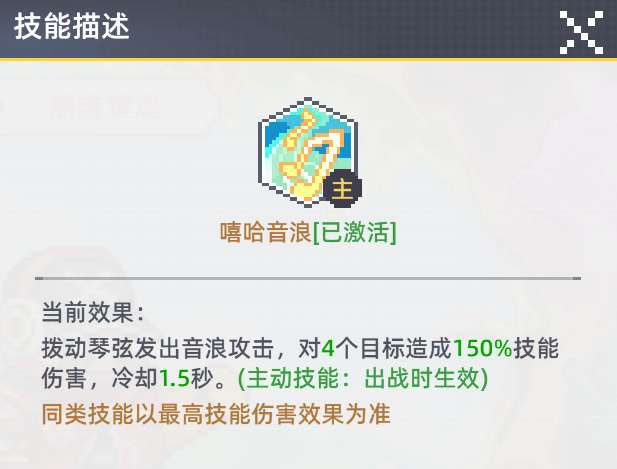 潮流黄鸡的主动技能 “嘻哈音浪”,绝对是战斗开场的绝佳利器。出战即可生效,只需轻轻拨动琴弦,就能发出强劲的音浪攻击。这音浪不仅炫酷,威力更是不容小觑,能对 4 个目标同时造成 150% 的技能伤害 ,而且冷却时间仅仅 1.5 秒。在瞬息万变的战斗中,如此短的冷却时间,能让潮流黄鸡频繁释放技能,持续对敌人造成伤害,为团队抢占先机。
