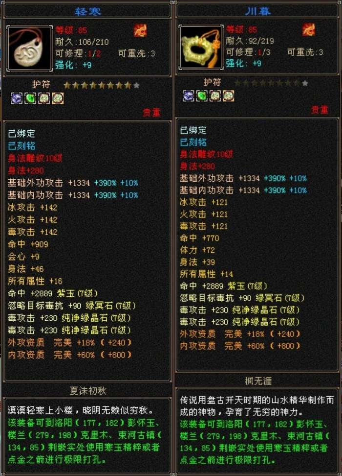 铁人三项挑不出毛病,尤其是项链:血上限、气上限、冰火毒三属性130、身法、所有属性。