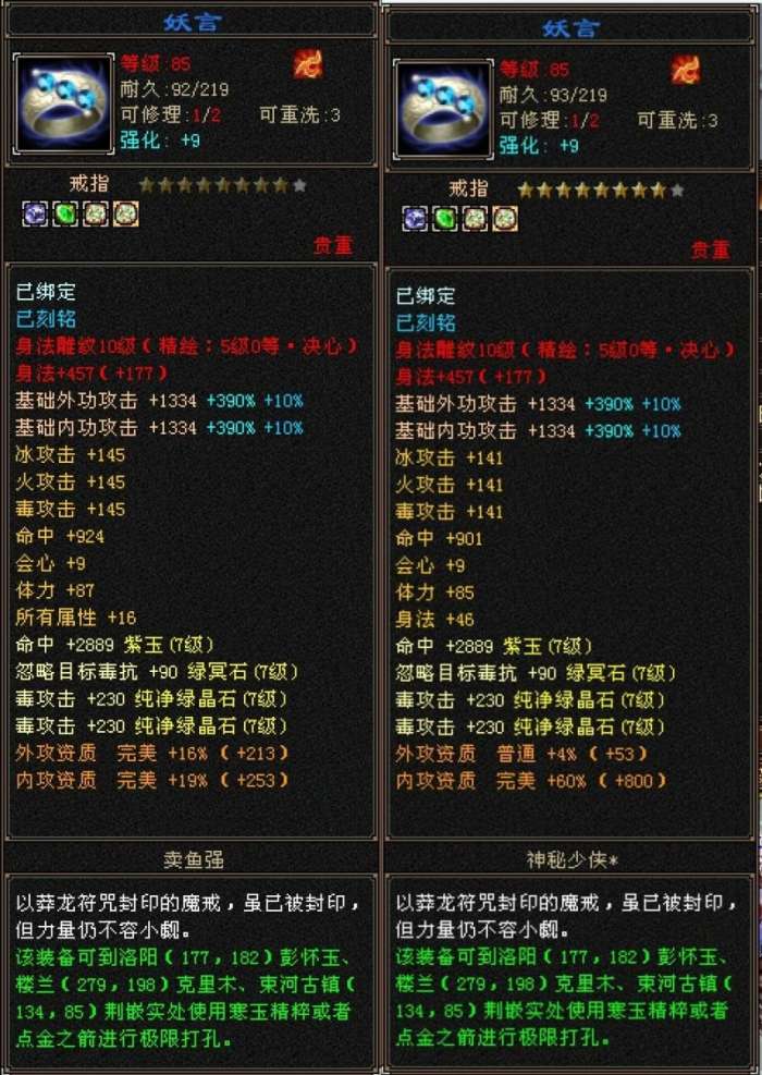 戒指都是冰火毒三属性、命中、会心、体力,区别是一个所有属性,一个身法。
