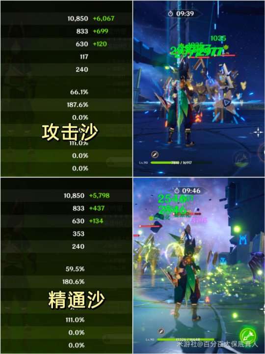 如果不发打激化,攻击沙是优于精通沙的,攻击沙伤害比精通沙高出16.9%,但考虑到一般提纳里都会打激化反应。综合考虑两者差距很小,副词条好的优先选择即可。