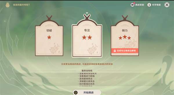 ● 每关斗虫挑战均有「切磋」、「专注」、「倾力」3个难度。挑战开启后,「切磋」和「专注」难度会解锁。成功挑战「专注」难度后才可解锁「倾力」难度。
