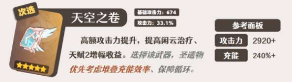 天空之卷就是闲云专武之外的第一选择,可以增加闲云的元素伤害,在使用普通攻击命中敌人的时候也会主动攻击附近的敌人,只是这个对圣遗物的充能需求会有所提升。