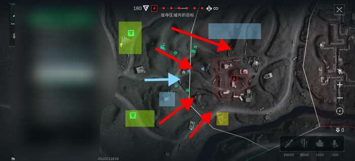 如图所示,绿色区域是开局友军复活点,红色箭头是进攻方的主要进攻位置,虽然守方拥有很多的掩体,但是对于有载具的进攻方来说可以无视。那么既然在被动的一个局面,有着良好的枪位以及人员安排是必不可少的。