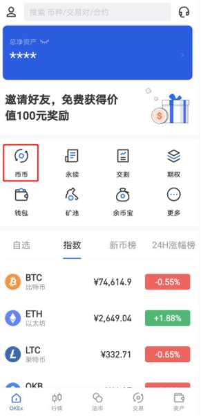 1、打开欧易OKX手机版,在首页上方导航栏中选择币币,即可进入币币交易页面。