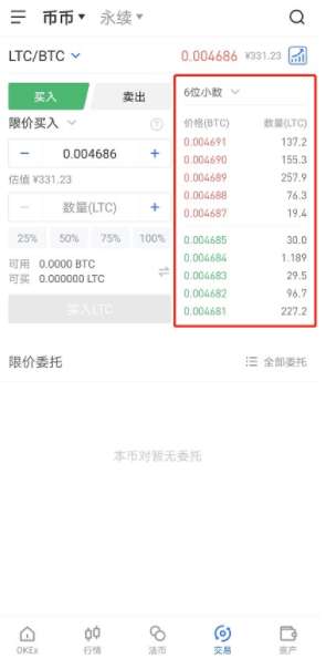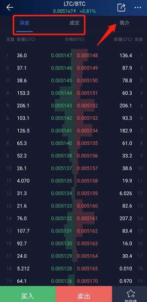 3、页面右边是交易深度页面,可以在页面中看到买入和卖出的挂单情况,上方红色区域是卖盘,下方绿色区域是买盘。