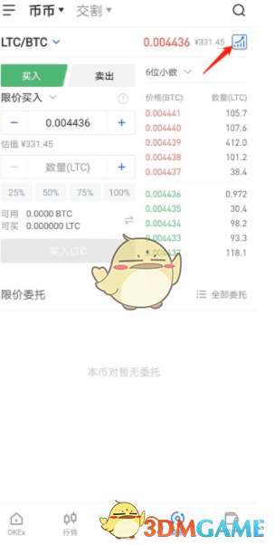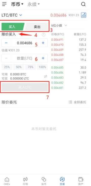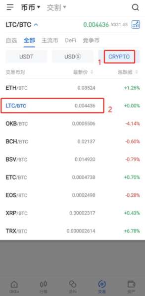 2、选择交易区,例如CRYPTO交易区,然后选择交易币对,例如LTC/BTC,接着选择买入/卖出,选择需要的委托类型,输入想要买入/卖出的价格和数量,点击买入/卖出即可。