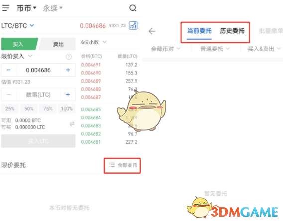 4、点击页面下方的全部委托按钮,可以看到当前委托和历史委托,委托单里可以详细看到委托时间,币对和成交量等信息。
