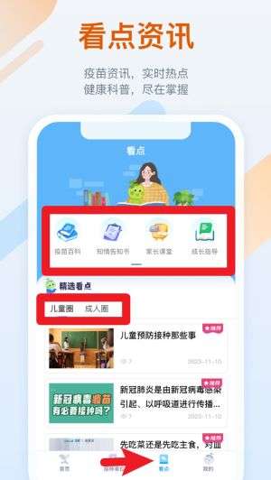 3、点击底部“看点”栏目后可进入资讯界面,浏览疫苗百科、家长课堂等内容,并可获取推荐文章。