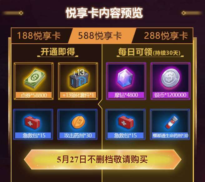 188 288 那俩玩意没啥用 买这个是冲着强化券去得,那点钻石,呵呵 买了就是憨憨