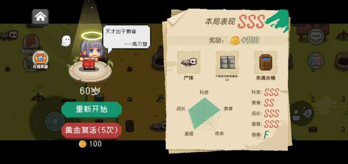 1传承 这个游戏跟原作一样(不明白的去了解一下原版作者制作ohol的初衷),核心是传承,传承的高低是你评分能否达到sss的关键,这就是很多人没法达到sss的原因,那就是不养孩子传承没有达标;