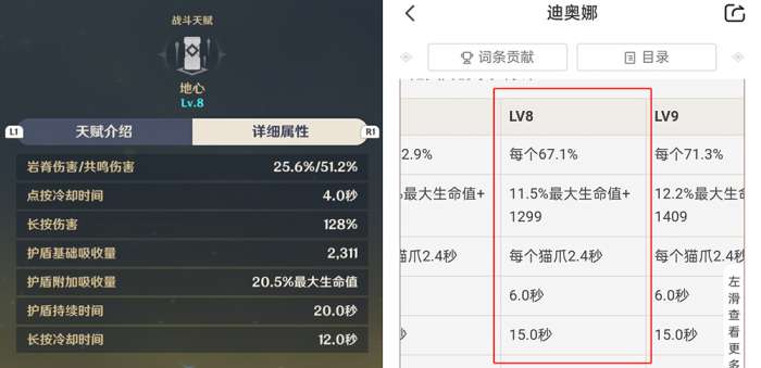 而且相比之下钟离的护盾实在太厚了,同等级下钟离是20.5%生命值+2311,而迪奥娜是11.5%生命值+1299,几乎高出了将近一倍!更别提钟离造盾时还会造成岩属性伤害,触发元素反应又能再造个护盾出来,双重护盾简直肉到不行。