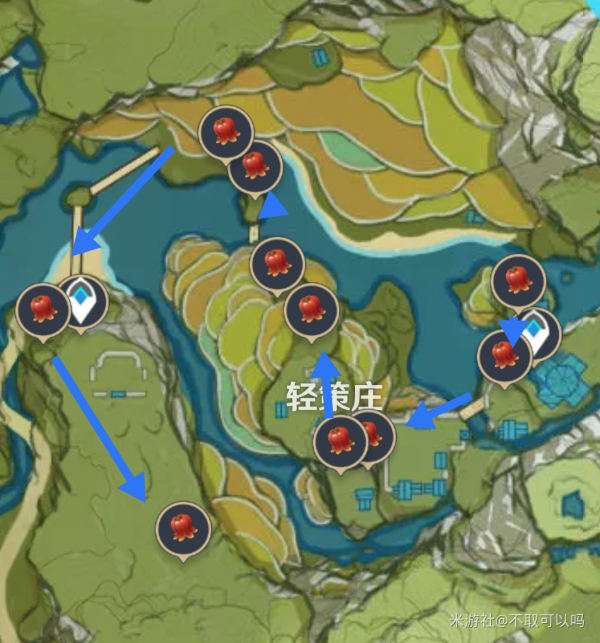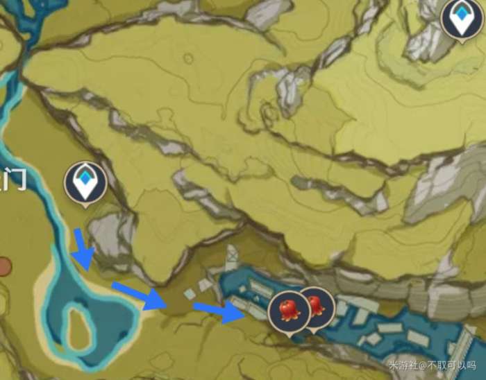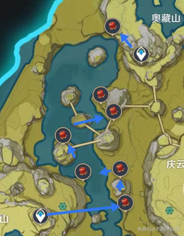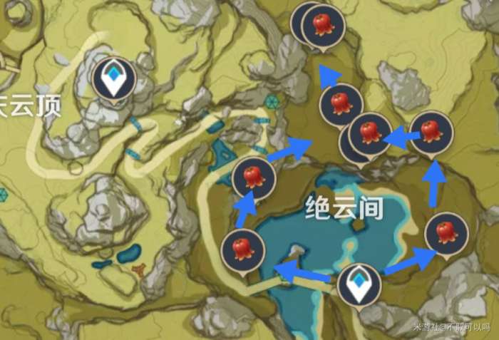 (从琥牢山传送点按照路线走可以一次取得许多绝云椒椒)PS:奥藏山还有一丛绝云椒椒,从传送点直走就可以.