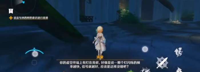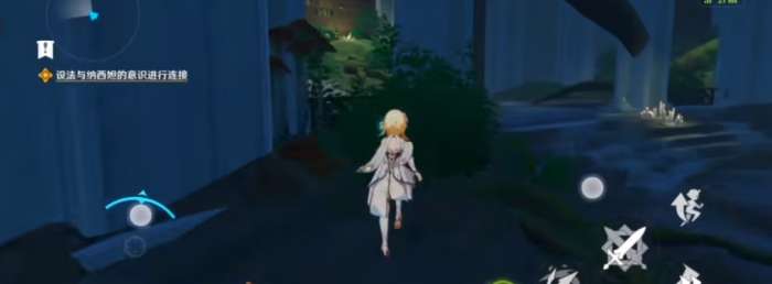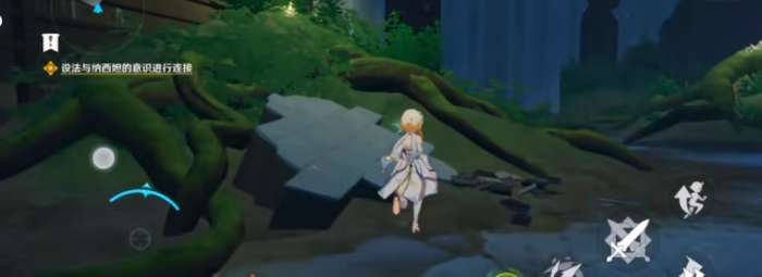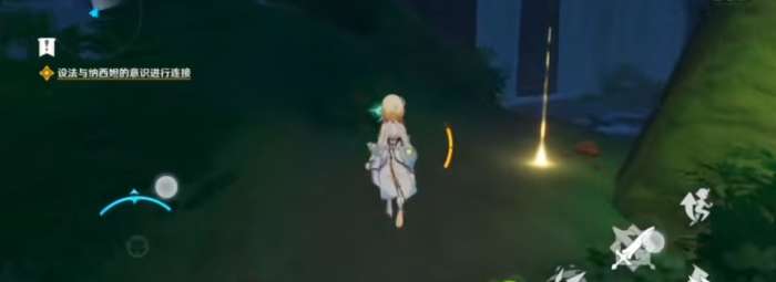 4.最后向着面朝土堆的右方走,在树根那里可以发现一个发光的点,那里就是任务要求的信号最好的位置了。