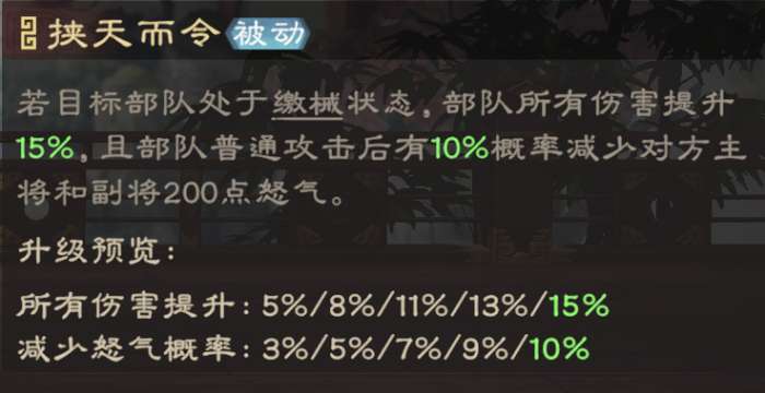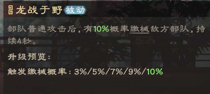 被动“龙战于野”在部队普攻后概率缴械敌方部队,一般来说3级(7%概率)以上就有较高的缴械概率,可以更好针对普攻阵容;如果目标处于缴械,部队造成的所有伤害会提升,届时普攻、主动技也可打出更高伤害。