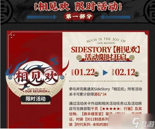 活动时间:1月22日-2月12日,玩家们可以在活动期间完美通关“相见欢”关卡,累计获得丰富奖励。