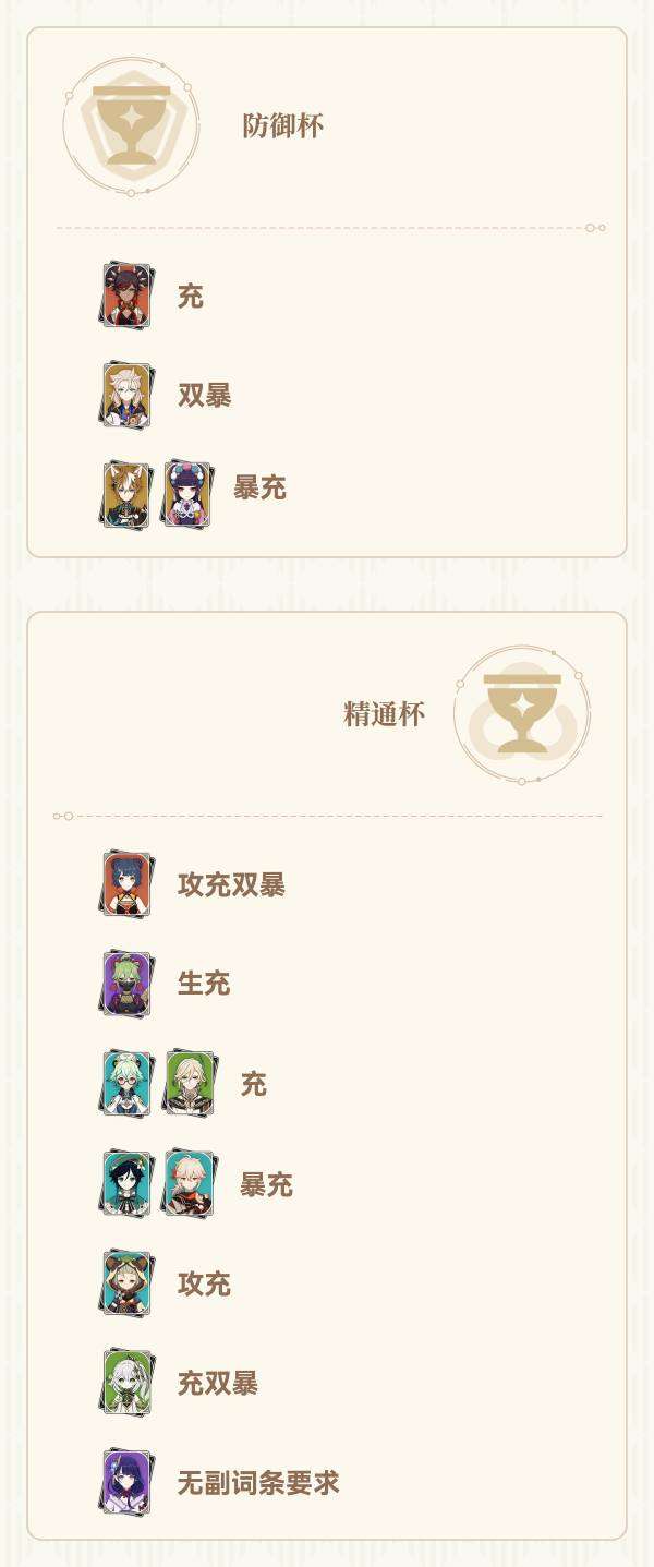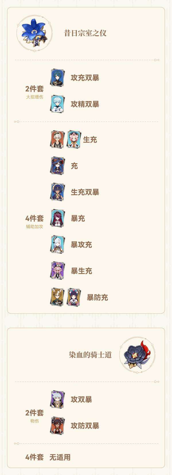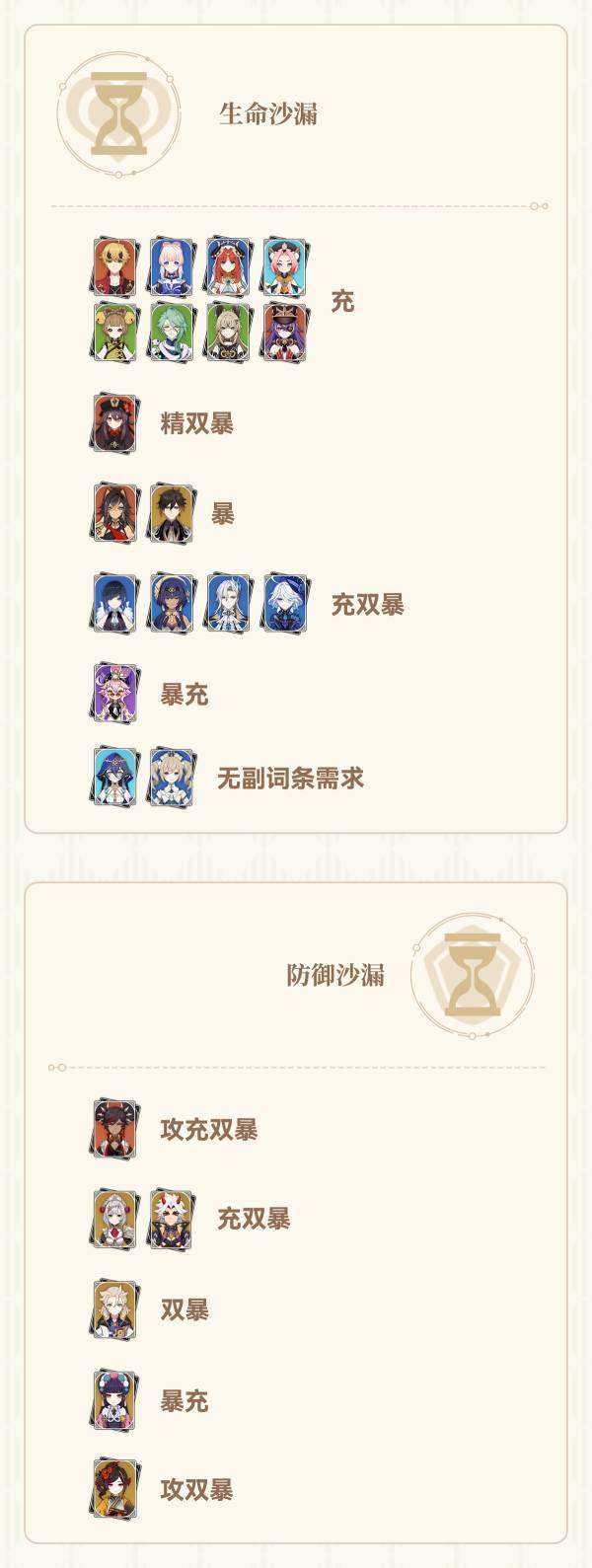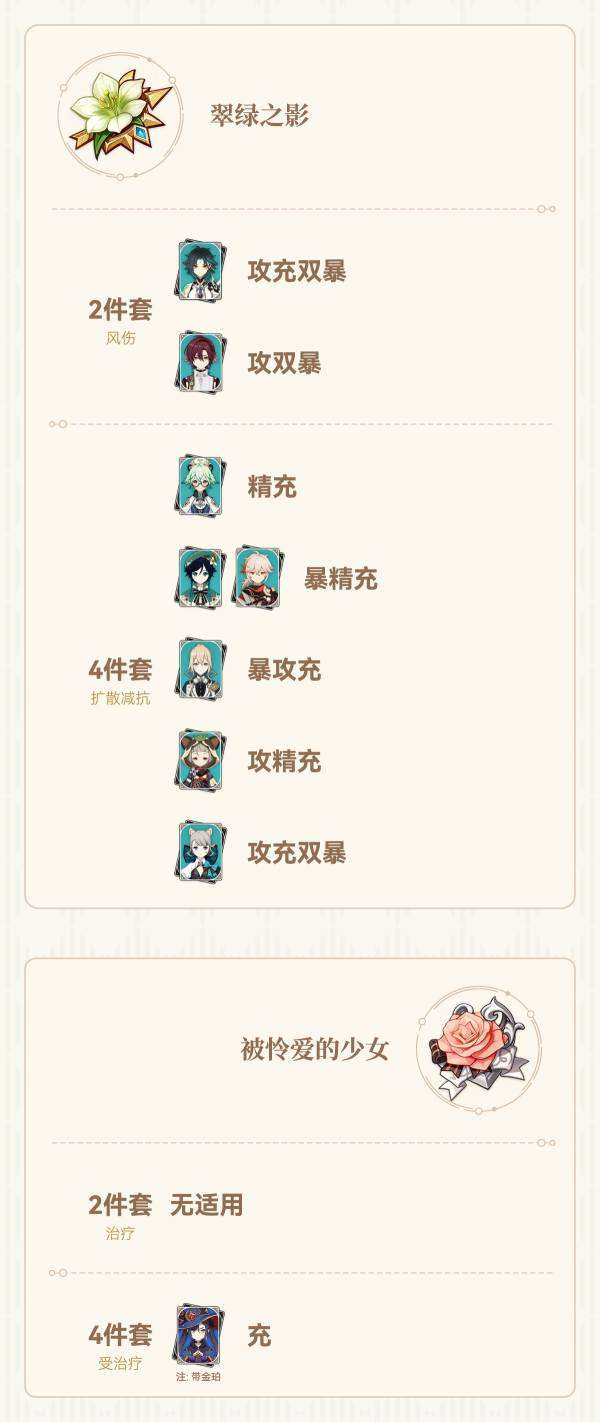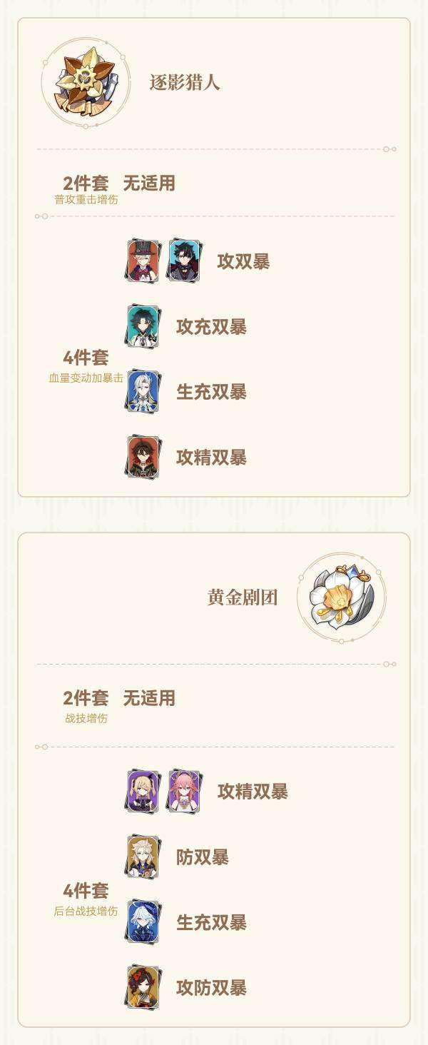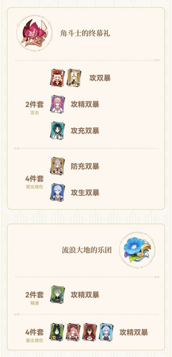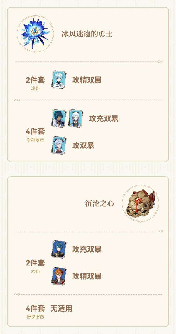 (双暴头,属性伤害杯,攻击沙是一个输出角色的通用配装,不再详细列出适用角色。特别注意暴击头还可能给辅助角色用来触发西风武器)