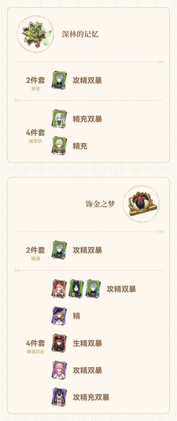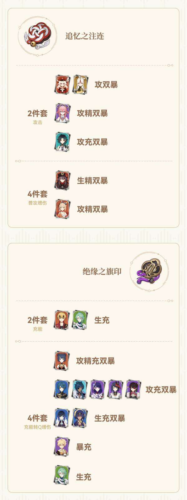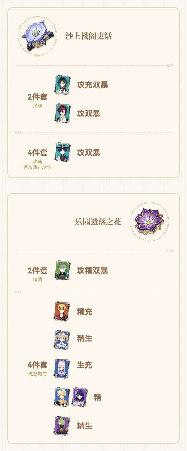 大家好,这里是茶茶。《圣遗物留弃指南》主要对圣遗物仓库溢出的情况,提供按圣遗物套装和主词条整理适用角色和所需的副词条,以方便筛选不需要的圣遗物。