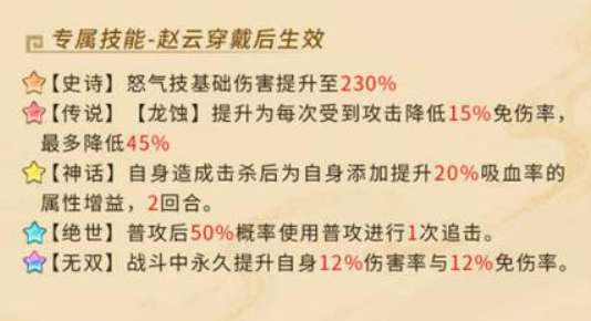 其实他还有一定的天赋效果可以进行激活,传说1星的时候,赵云可以激活的是虎魂的效果,也就是说解放一下,如果有阵亡的队友,那么在其中就会给赵云带来2点怒气的积攒,在敌方武将阵亡的时候,他也会有两点怒气的积攒,所以在这里使用各种怒气技能的循环机,这上面会比其他的角色更快到达他的回合,另外在达到2星激活的时候,生命加成虽然只有7%,但是根据上面的技能进行搭配的话,血量上面大家也不用担心没有足够厚的数值,达到传说三星的话,激活的则是防御的加成,有了这个防御加成的话,安全性就会提升一个层次啦。
