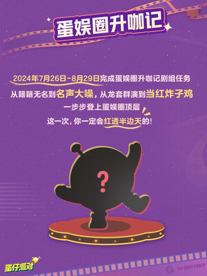 7月26日-8月29日,【蛋仔电影节·剧组通告】活动开启,化身《重生之制霸蛋娱圈》爽文主角,开启疯狂升咖之路,成为最受瞩目的演艺届新星!
