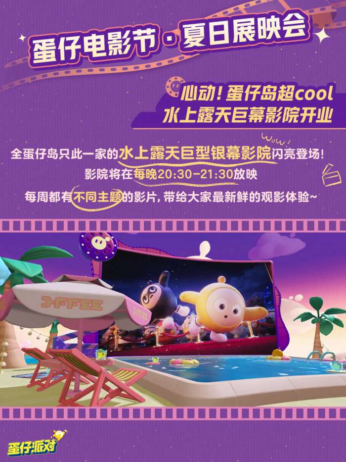 届时,看着唯美的粉紫渐变落日晚霞铺满天空和水面,泡在全蛋仔岛只此一家的绝美泳池观看露天电影,享受一场视觉与心灵的双重盛宴~