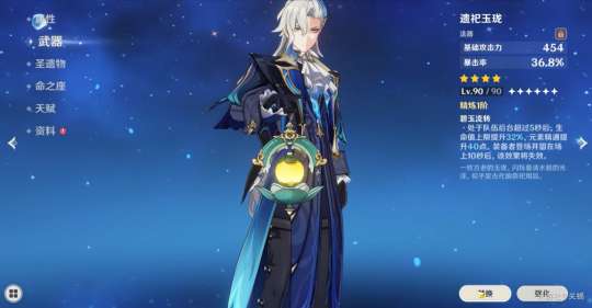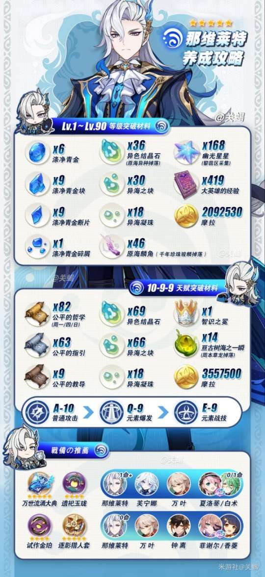 五星武器推荐:万世流涌大典;四星武器推荐:遗祀玉珑、试作金珀、流浪乐章。如果将遗祀玉珑精炼等级升至满级,该武器提供了高额的百分比生命加成,是目前与专属武器万世流涌大典差距最小的武器(伤害大概差距7%左右);试作金珀的生命加成能够提高那维莱特的输出,在施放元素爆发后还能为自身额外回复能量、为全队回血,缓解角色的元素能量积累压力。如果没有专属武器或遗祀玉珑,可以直接选择试作金珀。