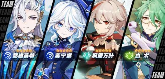 队伍成员包括:那维莱特(1命及以上)、芙宁娜/莫娜、万叶/琴、夏洛蒂/钟离/白术(1命及以下)。其中,白术到了2命开大招会抢元素反应,需要注意。如果那维莱特是0命,则不带芙宁娜的双水三色队总伤害略低于四色队,但带上芙宁娜后,双水三色队总伤害更优。而当那维莱特1命「尊荣的创定」后自带一层固有天赋「古海孑遗的权柄」的「遗龙之荣」,选择双水三色队最优。