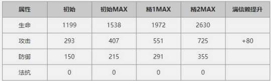 角色满级时的基础血量为2630,在进入副本后会增加到2946。与同级别的弗兰卡相比,血量稍低约600,但比暴行、因陀罗和拉普等角色都要高。攻击力方面,在满级且信赖度满时,加上潜能可以达到832,处于中等水平。