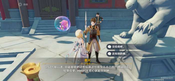 返回璃月港,向嘉义汇报送礼情况,并将小六的礼物给他