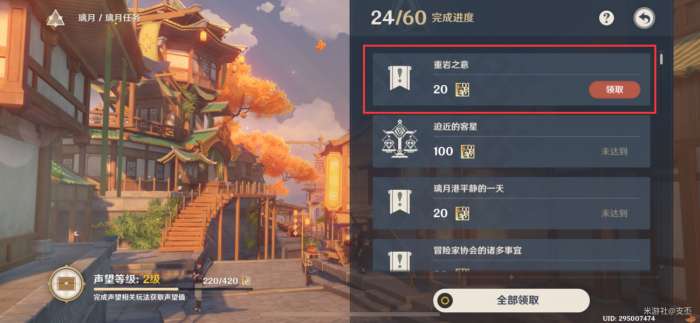 完成重岩之意任务后,旅行者可以前往「璃月总务司」干事·小雨处,获得声望值+20