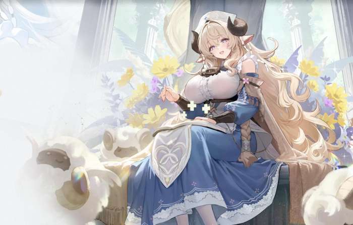 头顶有一对深棕色的弯角还有羊耳,是兽人族的典型特征,软萌又很有辨识度。金色长发加侧边麻花辫,搭配温柔的紫瞳,表情也是软软的,带点慵懒感,亲和力拉满了。服饰则是蓝白相间的护士风长裙,蕾丝花边加精致刺绣,既复古又优雅,很贴合护理师的身份。
