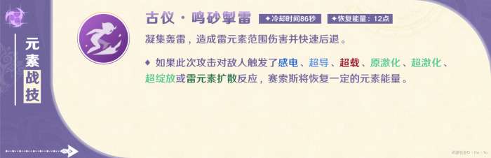 当E技能触发了元素反应,会立即回复12点元素能量。而掉落的2个雷元素微粒会在空中飞一会儿,然后被主角赛索斯吸收后才会回复元素能量。因此,在实战中,常规循环技巧是先释放Q技能后再释放E技能。如果Q技能的元素能量已经充满,那么先释放E技能再释放Q技能,则会丢失直接回复的12点元素能量。
