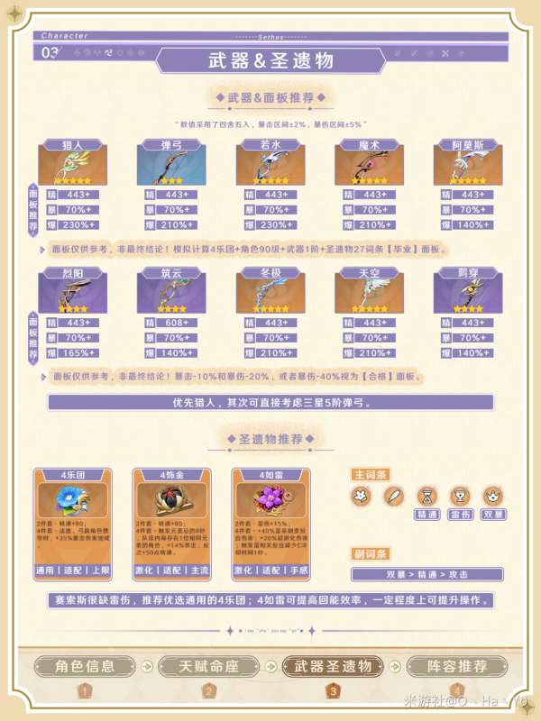「流浪大地的乐团」4件套,可以提供80点精通和35%的重击伤害加成(对于赛索斯来说,这意味着雷元素伤害加成)。赛索斯的主要属性是精通和元素伤害加成,因此这个套装是最适合赛索斯的装备之一。此外,赛索斯的两种主要输出技能——Q状态下的A和贯影箭——都是重击伤害,因此该套装的适配性非常好,并且期望能够提供最高的伤害输出。