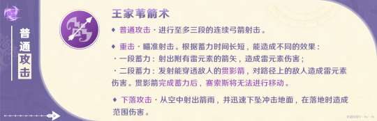 赛索斯使用的蓄力箭技能有一段蓄力和二段蓄力,其中以二段蓄力的「贯影箭」为主要技能。当「贯影箭」命中敌人时,会施加强雷附着效果,并且无需等待附着效果的冷却时间。