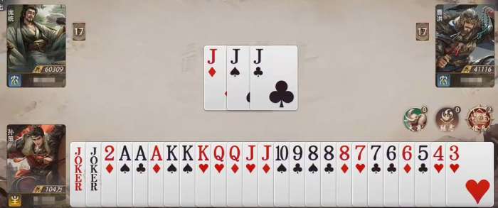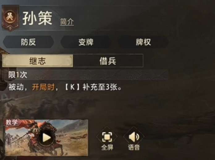 孙策的技能当中第1个技能是就是大家开局的时候,无论自己手中的卡牌有多少张都会给大家直接添加3张J,且不管是什么位置放牌都是一样,如果说大家手上有4张J,利用这个技能再给大家加3张J,就相当于玩家手中有有7张J,所以他的被动非常的逆天,而且这各技能还是不会被阻挡的,一般是开局就发动的,不会被任何场内因素给影响,相对来说其实孙策操作还是比较简洁的,但是技能效果非常适合新手快速上手。
