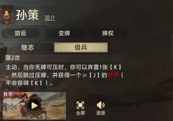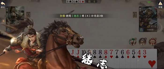 玩孙策大家就要利用先手优势快速打出炸弹,建立压制,后期选择坐骑方面可搭配赤兔马增强出牌连贯性,候选绝影马进一步提升控牌能力玩好孙策,所以他的上手难度只有两星,而技能只能发动3次,当大家无牌可压的时候,大家才可以丢掉一张最大的牌,这样的技能本身很简单,就是大家只要把控一下使用时机,手上大于等于勾的牌越多的时候,去用这个技能效果是越好的,因为大家此时更容易摸到炸弹,就是哪怕摸不到炸弹,再不怎么差三带的牌总是有机会拿到的,而且如果大家的手上有2在,那大家就要考虑,丢掉王牌或者2换来的这个牌收益会不会更大一些,但是犹豫可能就会错过机会,因为他的技能发动时机比较重要,所以玩孙策大家就一定会抓时机。