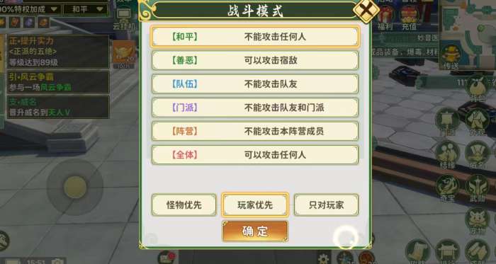 另外,如果你喜欢PVP,也可以留意在战斗模式种可以切换模式攻击对方阵营,还有正邪战场这些,都是跟阵营有关系的,所以阵营也是贯穿整个游戏。