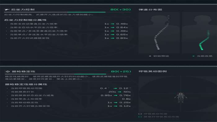 在弹道变化特点方面,与初始预设相比,子弹分布更加集中,尤其是在垂直和水平方向上的扩散明显减小。后坐力控制:后坐力控制数值从50提升到了80(增加了30),据枪稳定性数值从55提升到了80(增加了25)。