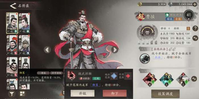 曹操武器选倚天物攻法攻双加成,防具堆血量,每1000血提升5%治疗效果。技能研修把魏武挥鞭升到3级追加20%减伤,短歌行研修后可回战意。除了装备上搭配,玩法上也是有小技巧的,像是主线巨野夺城战要分兵,曹操与张辽守左路村民,夏侯惇卡隘口拦骑兵,李典右侧治疗。过程中需要曹操去点油桶,点燃之后能造成3×3燃烧,燃烧可以烧掉每秒8%最大生命伤害,然后郭嘉起手技能冻住伏兵群。8回合内集火右侧箭塔,别管宝箱直奔BOSS。这个过程如果曹操能有戴青囊书每回合回5%血能省不少事。