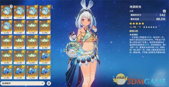 当队伍中每出现一位水元素外的队友,就可以获得10%增伤,2异色时获得20%增伤和32精通,3异色时可得30%增伤。