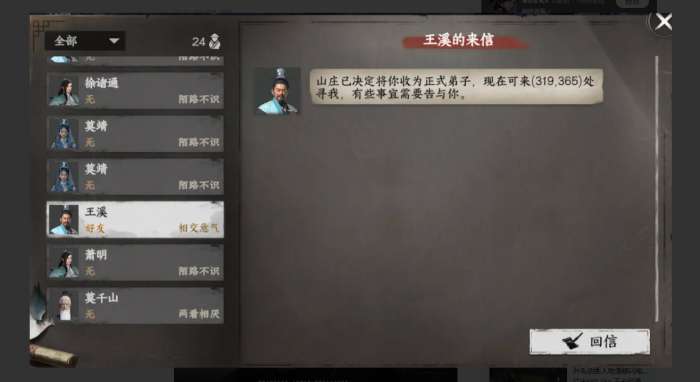首先,你需要前往394.360的地点,触发剧情并选择“在下随你前去”。剧情完成后,去砚溪山庄的书房,研磨书桌十次,之后会收到一条提示。接下来,前往314.368的那棵大树,摘取剑宗总诀昆仑化境卷。此时,你需要满足一定的条件:儒学修为达到100。如果儒学修为不足,且没有收到飞鸽,那么可以前往319.365与王溪交谈,加入砚溪山庄。